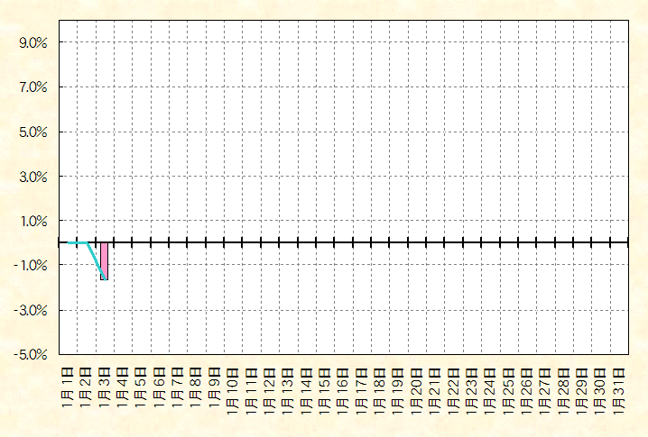 棒グラフが日々の損益、折れ線が年初からの累積損益(いずれも%)です。