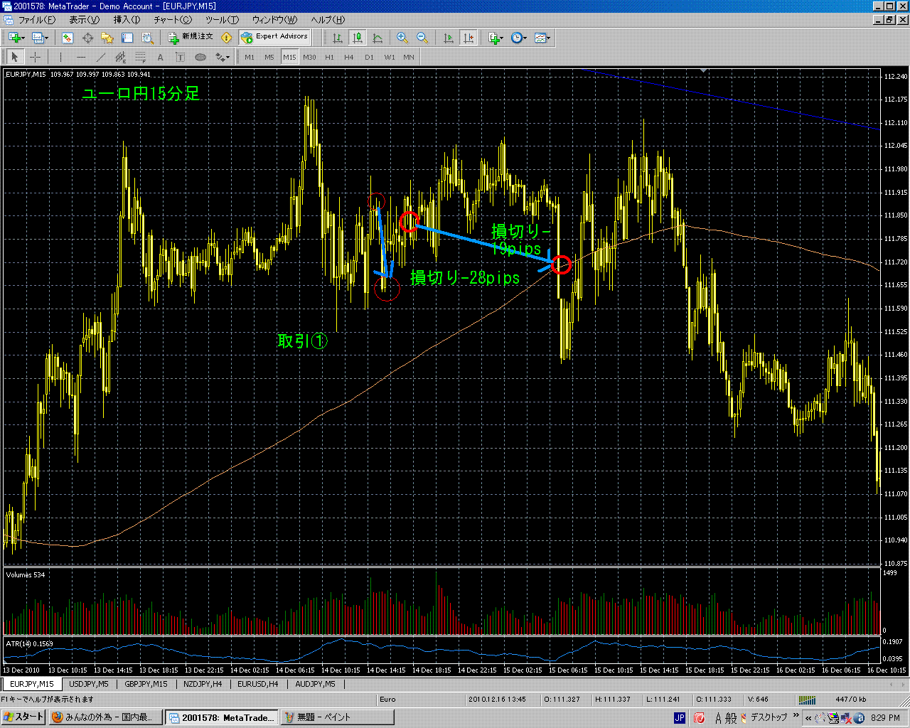 反省点: 取引①の後にすぐトレードしてしまった。相場はその後、逆方向に進んでいく。多少感情的になり、再度同じようなトレードを繰り返すパターン。間違えを認めて、同じトレードを繰り返すべきではなかった。負けたトレードの後にすぐ同じ取引を繰り返すのはやめよう。エントリーポイント、理由もチャートポイントやチャートの形をもとにしていない駄目トレード。反省点多し。しかし、損切りキチンとできたのは○