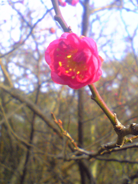 紅梅にもいろいろ種類があるようですが、早咲きの一種でしょうか。