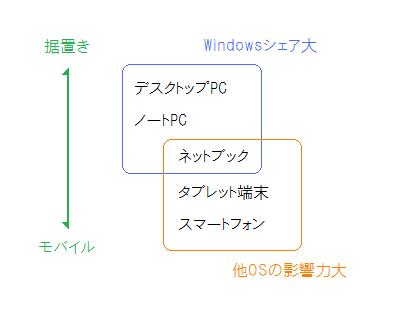 Windowsは従来の端末(デスクトップやノート)に圧倒的なシェアを持っていますが、