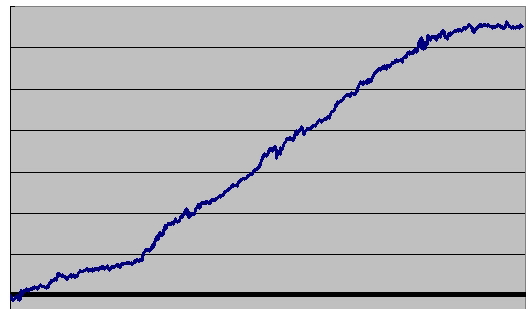 非常に興味深かったのが(決して他人事ではないという意味で)、剛腕システムトレーダー「KKさん」のブログで公開されていたKKさんのシステムの資産曲線。