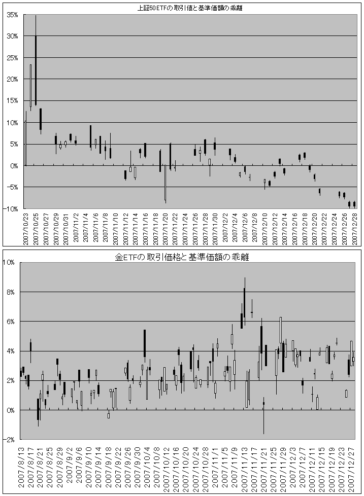 金、上証50ETFの基準価額と取引値の乖離(07/12E)