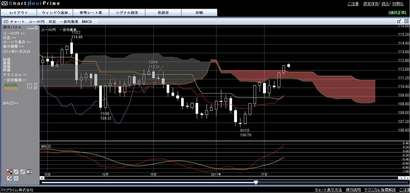 そんな訳で、今日はユーロ円のチャートを見たら、「おっ!結構、買いサインが出ている!」