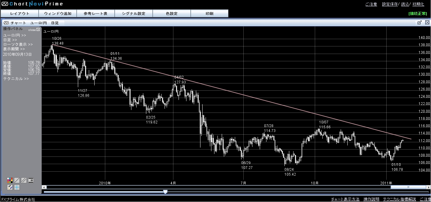 一応、2009/10の高値138円から上値抵抗線が引けそうだったので引いてみた。