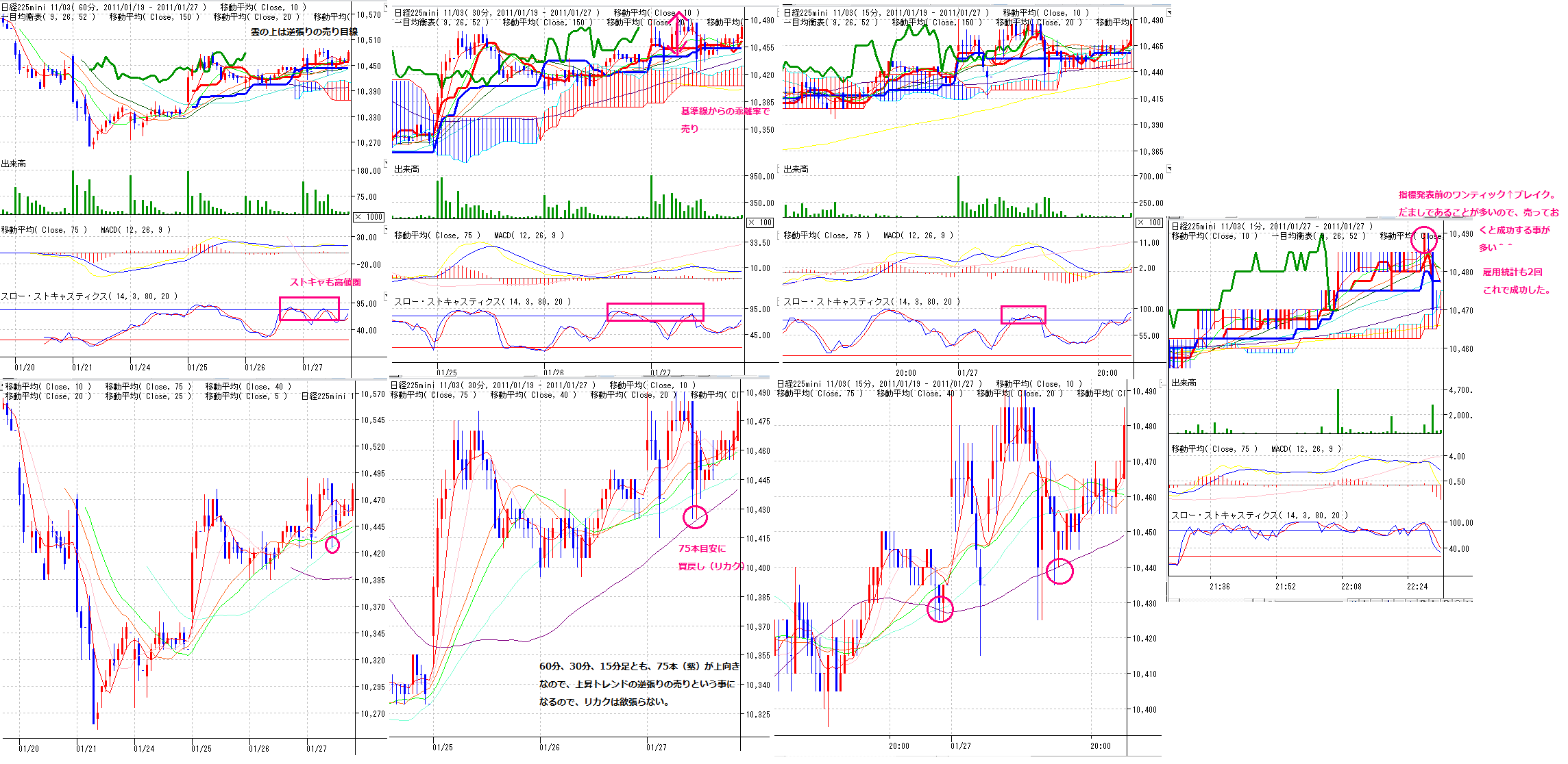 ・分足75本が上向きのときは、上昇トレンドの中の逆張りの売りなので、売りはあまりひっぱらずにこまめにリカク。