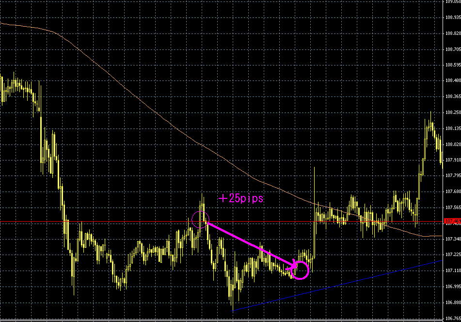 理由 : 108.48円から107.00円付近まで大幅に下落。底を打って、107.47を上限にレンジになっており、 107円での反発も大きなV時での底を打った形をしていないため、レンジブレイクとみせかけ、戻ってきたところでさらなる下落を狙ってエントリー