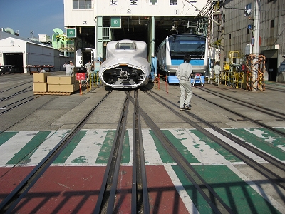 この工場では国内向け以外に海外(台湾新幹線)なんかも製作しているので、いろんな軌道(線路)が工場と工場の間を繋いでいます。