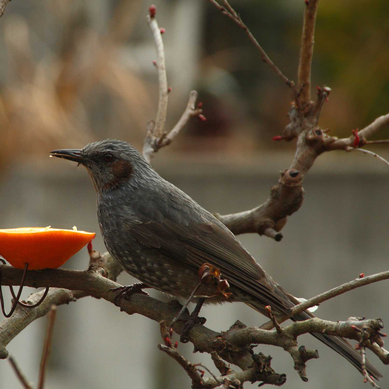 庭に野鳥(ヒヨドリ or ムクドリ)が庭の柑橘類や野菜や花までもつつきに来ます。