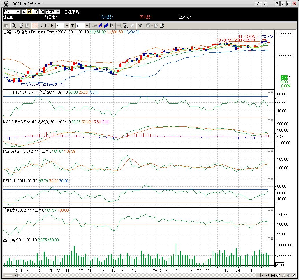 騰落レシオ25:119.52(125.51) RSI14(日足) 62近辺(52近辺) サイコロジカル12:50(50)