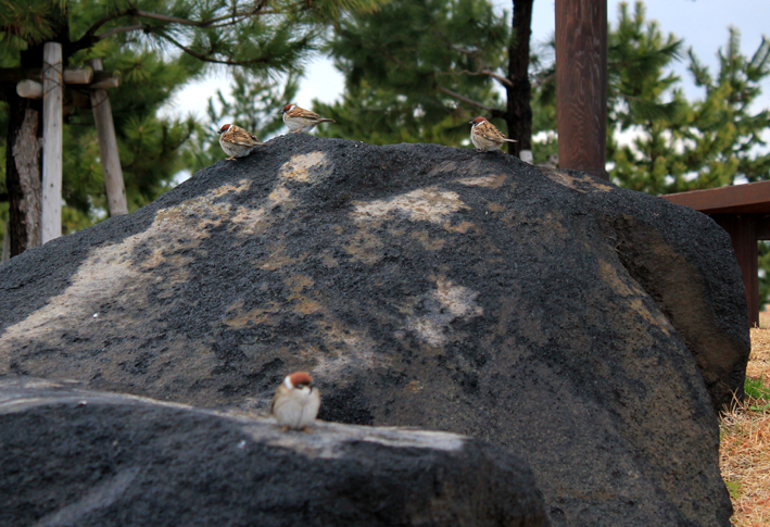 昼食後港に寄ってみると、風が少しあるので雀たちも体を丸めています。