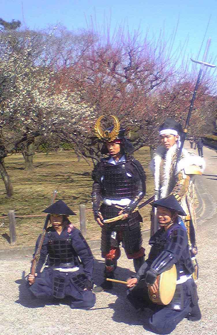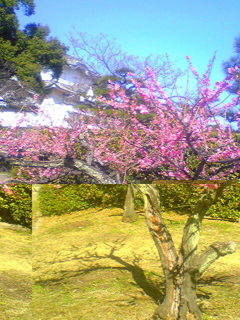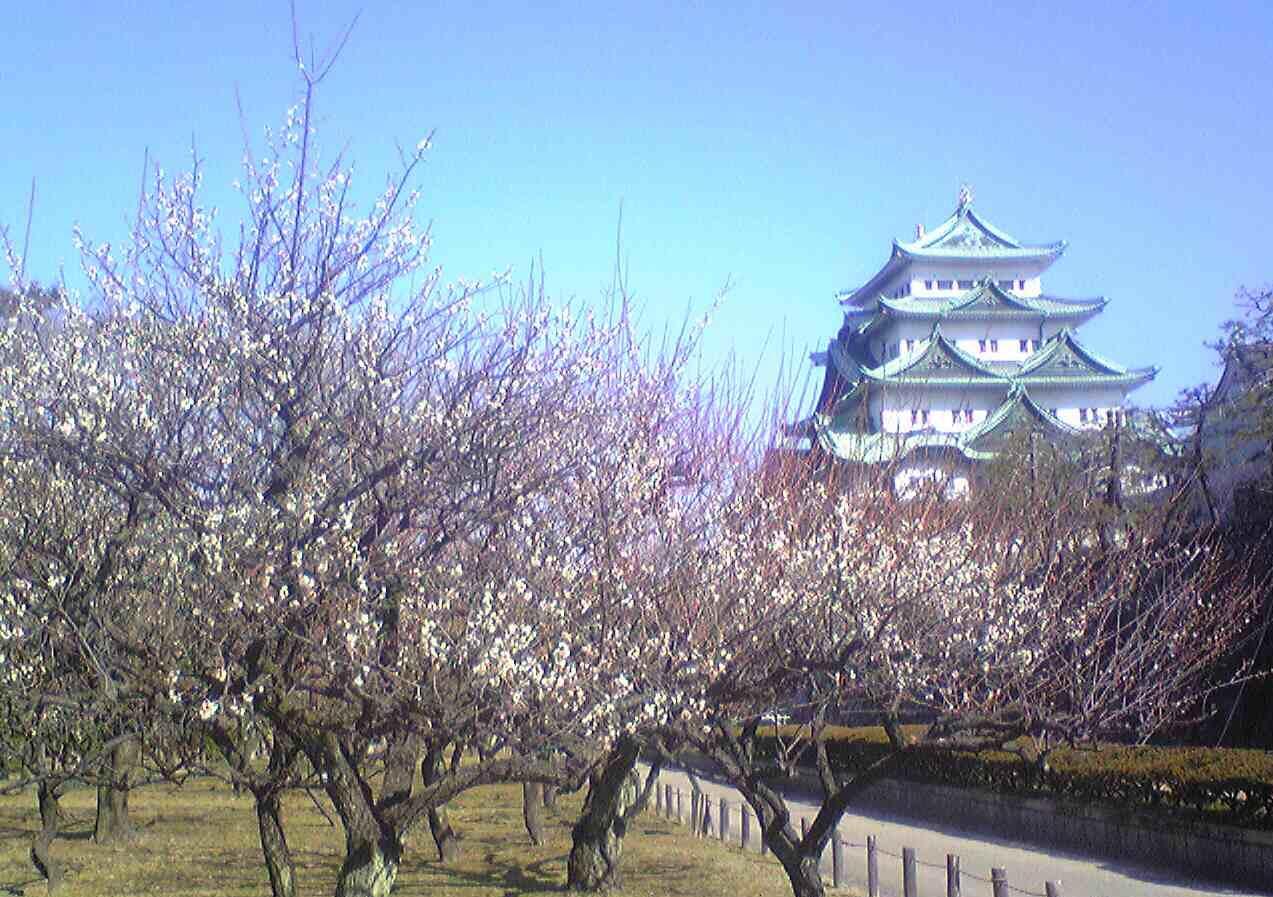 名古屋城も長束という梅が咲いています。武将隊の徳川さんも記念撮影です。すごい人気で、門の方まで長い列ができていました。徳川家康の命で作られたといわれていて、何か因縁を覚えます。二の丸では道しるべが咲いていました。どちらも古い木で年月を感じる木です。