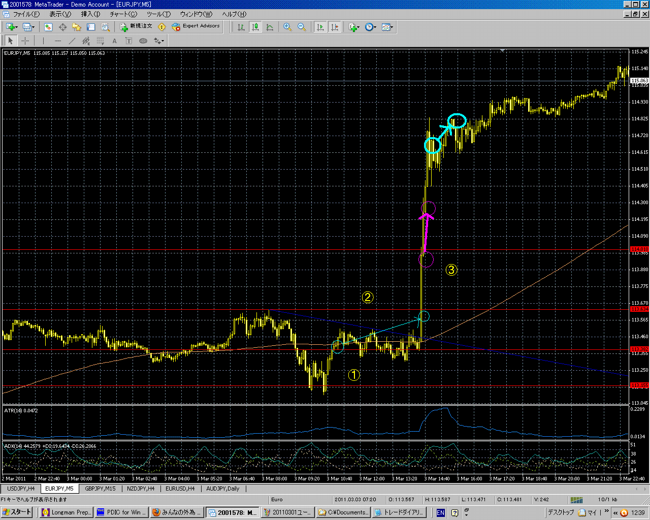 理由 : トリシェ総裁発言後のロングの動きになんとなくついていってしまったトレード。114円をブレイクしたため、買い目線の相場の組み立てを行ったのだと考えられる。