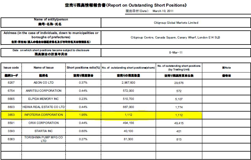 インフォテリアをCitigroupが去年の5月20日新規空売り開始した事。