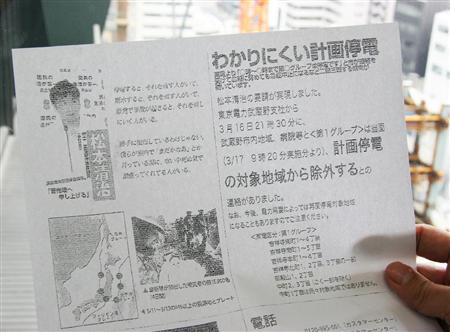 ”菅直人首相(64)の元秘書で、おひざ元・東京都武蔵野市の民主党市議が、東京電力に要請を行い、選挙区内の「計画停電」見送りを実現させたことを誇示するビラを配布していたことが24日、分かった。1都8県の延べ5000万世帯が不便と混乱を強いられているだけに、与党の力で停電地域が左右されたとすれば許し難い。東電は否定しているが、政府与党の信頼性を揺るがしかねない事態だ。