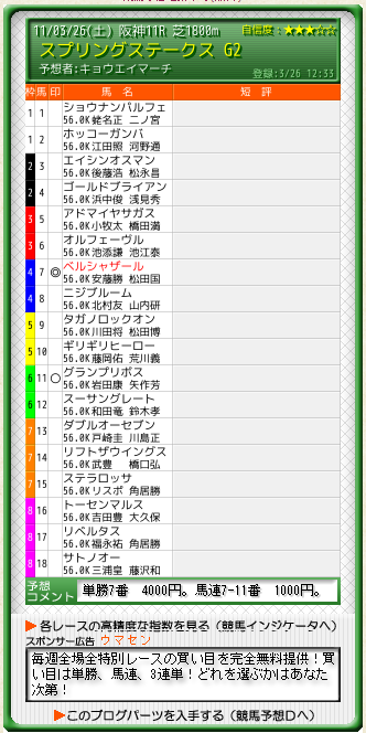 例年の中山では4年連続の3着で連対の無い父ミスプロ系ですが、阪神で行われる事によって上昇が出来ると予想しました。母父サンデーは今の阪神芝1800Mで良く好走していますので好材料です。