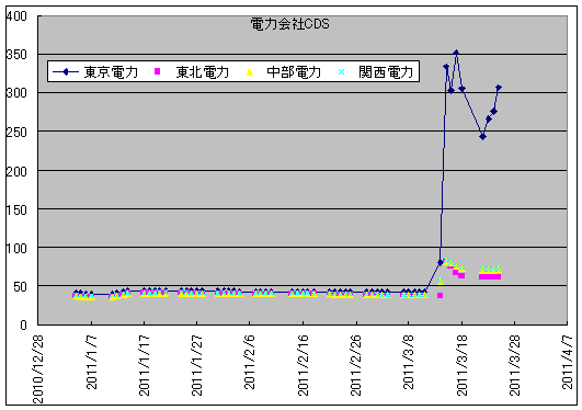 東京金融取引所発表のCDSをグラフにしました。東京電力のCDSに注目です。