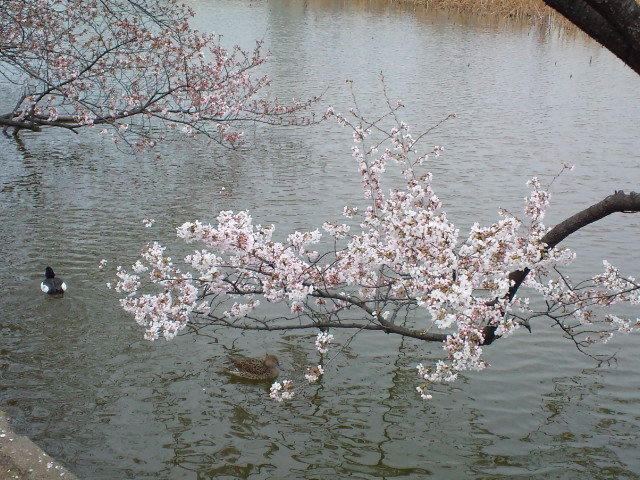 不忍池にはまだカモがいて、桜の木の下をゆうゆうと泳いでいました。