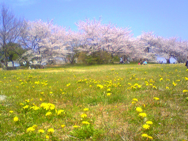 大高緑地にもタンポポが咲き乱れ、桜も咲いています。この光景は他では見えません。