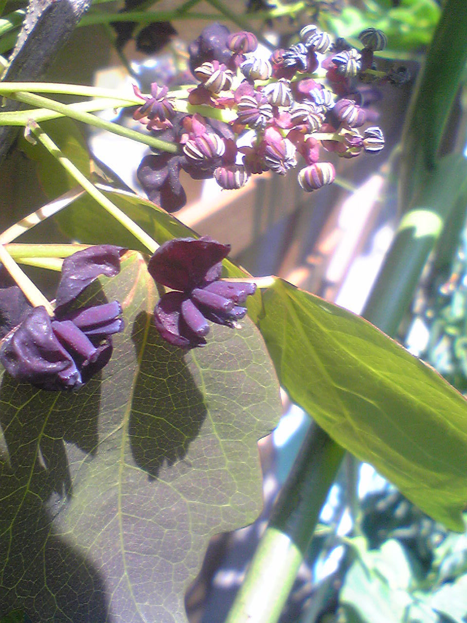 アケビの花が咲いている。この時期、ミツバアケビはつるが食べれる。水で少しさらして、ゆがけば、そのまましゃけ茶漬けなどをかけて食べると美味しい。取って直ぐですとアクはほとんどない。雄花雌花があり、受粉すると、雌花が大きくなり、緑色になってくる。