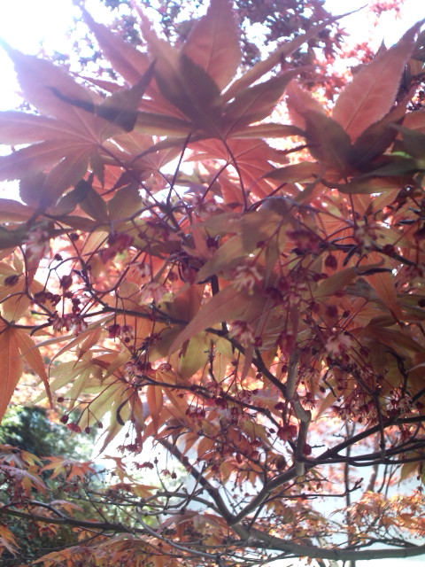 たまたまもみじの葉っぱが生えてきて、近くでよく見ると、ちっちゃな花が咲いていました。