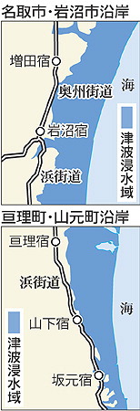 東北大の調査によると津波が奥州街道の手前で止まっている事が判った。