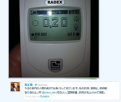 ツイッターによると私がフォローしているソフトバンクの孫正義さんが自分のガイガーカウンターの数値が政府発表の2倍以上だとツイートした。
