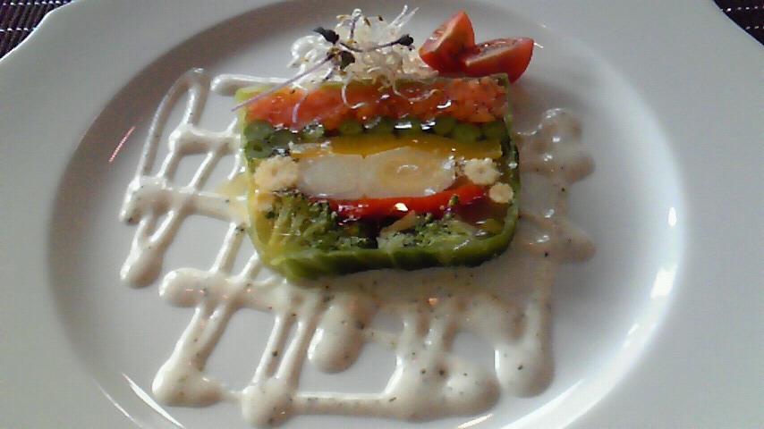 野菜が美しく並んだ、ゼリー寄せのような感じの、というか、テリーヌ風のもの。
