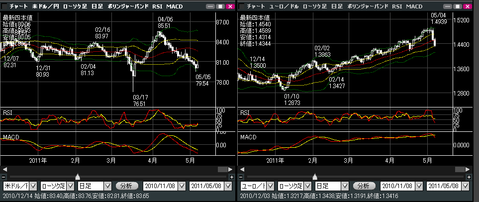 先週ユーロ㌦1.49ぐらいあったとおもうんですが、GW終わってみると1.43まで一気に調整