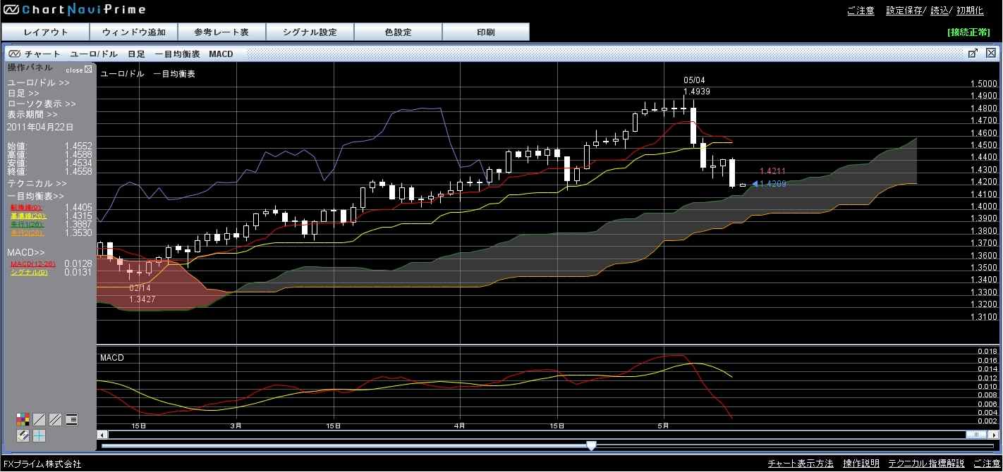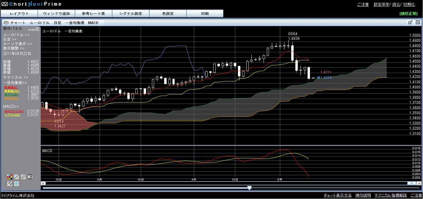 一目の雲と直近の安値4/18の1.4160が見えてきたので、ちょっと下げ渋るような感じ。