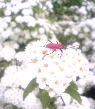 花に妖精が舞い降りました。先ほどまでは一瞬の舞踏会がここで広げられていました。お邪魔をしてしまいました。オスは飛んでいってしまいました。ハナカミキリの一種で、これらのハナカミキリムシをニンフとも呼ばれます。一年に1日しか会えない虫達です。偶然に感謝です。ベニカミキリに似ていますが小さいです。カミキリムシは有名なムシでも個体差が大きく良く間違えます。小島先生に持っていったら、怒られた事があります。