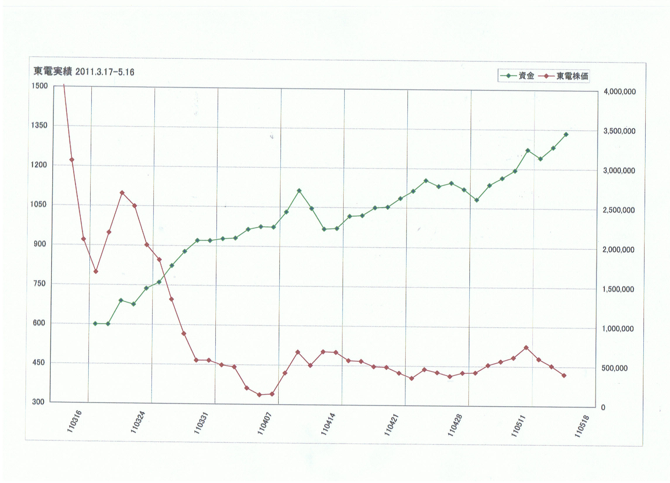 東電の1日新値法の公開トレードを開始して丁度2ケ月過ぎたので資金推移をグラフ化してみた。グラフは確定損益と含み損益を合計したその日の評価額である。若干のドローダウンはあるものの東電の株価の上昇下落に係らずほぼ一貫して上昇しているのがよく判る。まあ、こんなに上手く行くことはそんなにあるものではないのでいい記念になるだろう。グラフの形からは35%アップなのか3.5倍なのかは判りにくいが、このような公開できるほどの取引量のある株で2ケ月で3.5倍の実績は素晴らしいと思う。得た利益を次のトレードにも使う複利運用しているので順調ならばこのトレンドが続けられると思うが将来のことはどうなるとは言いにくい。ただ、いろんな問題があって人々の思惑が渦巻いている限りはこの方法は有効だと思っている。