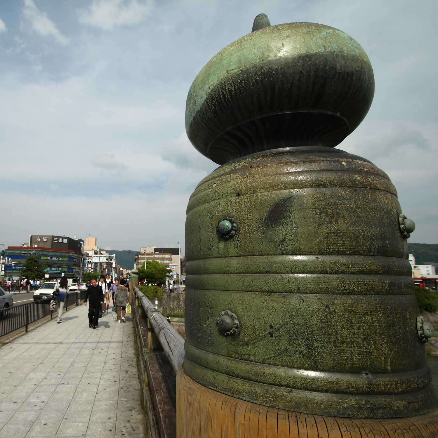手前に見える擬宝珠(ぎぼし)は、1590年に豊臣秀吉が三条大橋を作らせた時の物