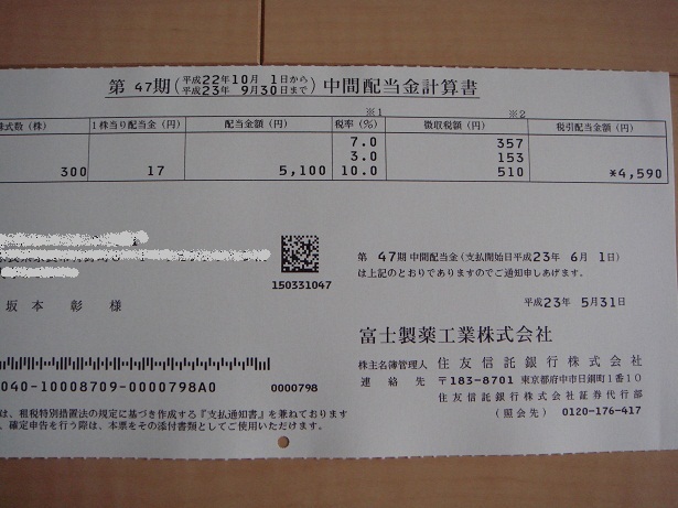 富士製薬工業 4554 から配当金が届きました。
