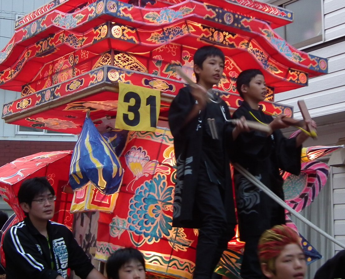 大人が付き添ってますが、前を、お囃子(おはやし)山車が太鼓を載せて進みます