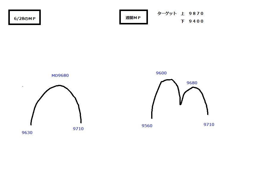 先週木曜の夕場9500でトレンドライン上限のサポートを確認したので、次は上を試すと思ってます。