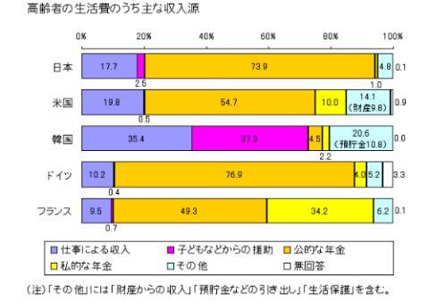 公的年金はほとんどなく、仕事、援助、その他の比率が