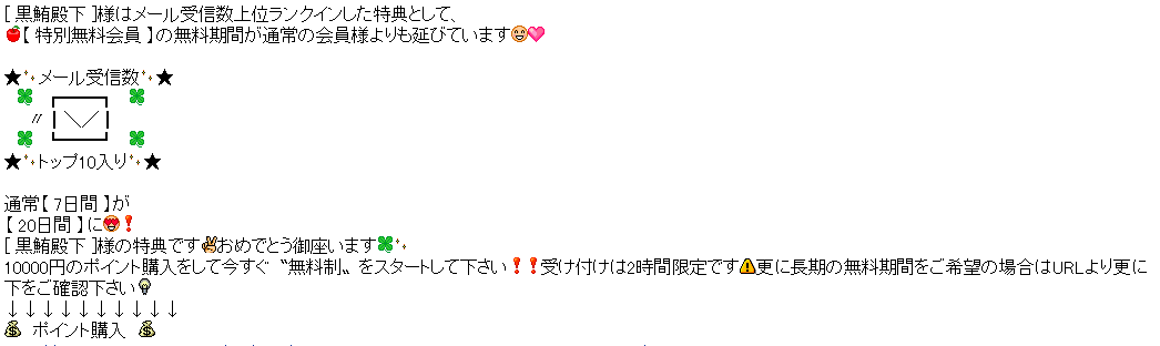 最初の頃は返事をしていたのですが、それだけで優秀会員様なんて言われたのですが、途中からポイントを買わないと話が続けられない仕組みになっていて、これが結構高い!!