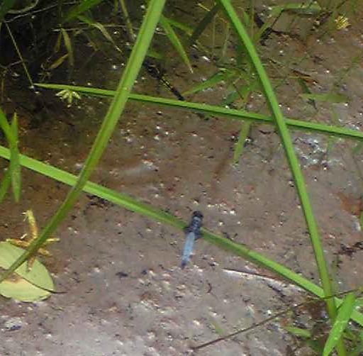 まさにトンボが産卵している。丸い波紋の真ん中に生みつけている。ちょんちょんと水面を叩くように見える。オスがそれを見守るように待っている。人間みたいな感じのトンボはオオシオカラトンボの産卵だ。普通はドッキングしたまま産卵することの多い、トンボだが、単独のこともある。卵が見えるだろうか?2011.7.3島田緑地