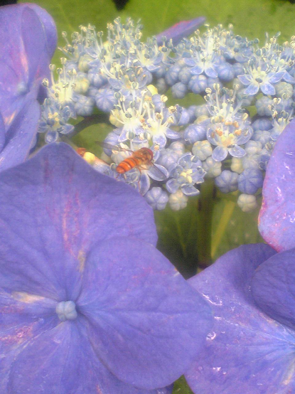 アジサイの本当の花の部分は小さいので、虫も寄ってこないかと思っていたら、ハナアブがやってくるんですね。