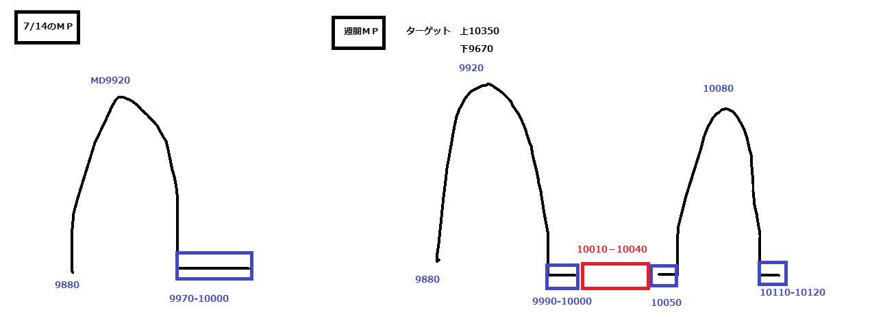 上値の抵抗はまずは上の窓10050、MPの山10060、10070、このあたりは重そうです。