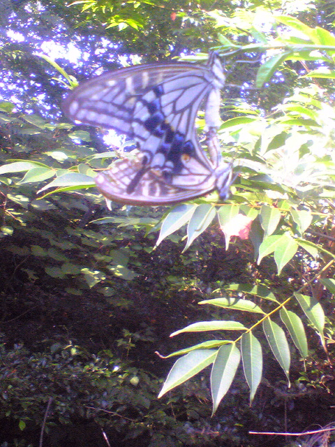 珍しい光景で夕方に蝶の結婚式、このまま寝るのでしょうか?オスはかわいそうです。