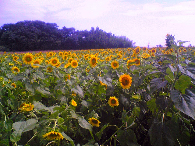 ひまわり畑が台風でなぎ倒され、復活して太陽に向かって伸び、途中で折れ曲がるも咲きそろった。