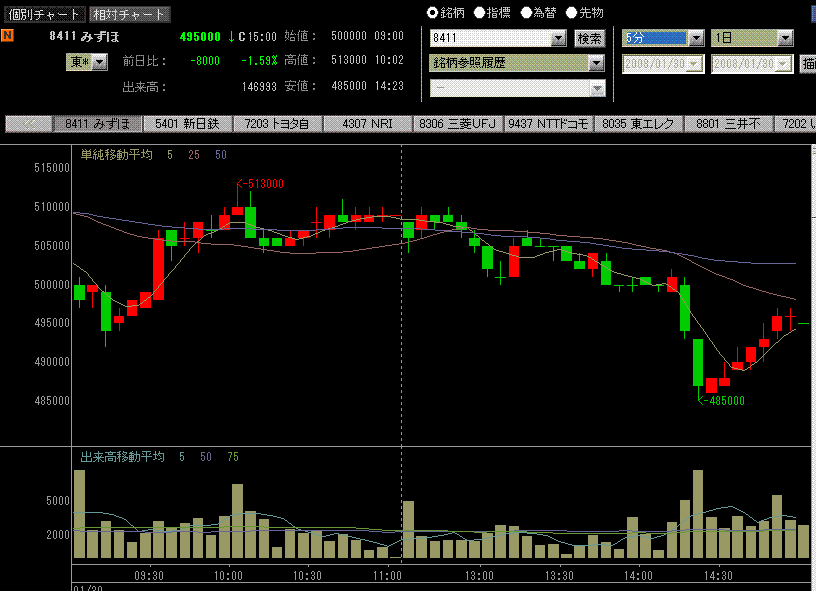 朝方発表された12月の鉱工業生産速報が事前予想を下回ったことやFOMCを控えての手控えから前場は揉み合いで推移、後場アジア市場が軟調だったことや(韓国がすごく弱い)、午後2時過ぎにみずほのサブプライムローン関連の損失が拡大するとの日経新聞のニュースが伝わり全体相場も下落していきましたが、大引けにかけては少し戻しました。情報格差が出来るし相場が荒れるので、日経新聞は場中にこういった情報を流すのはいい加減止めて欲しいです。
