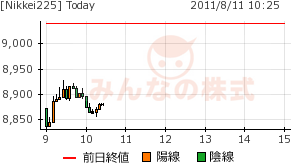 このチャートからも、下げトレンドの原因は、円高が原因とみる。昨日の後場の動きを止めた時期とドル77円割れが一致し、円高進行が今日の安値を決めているということから。
