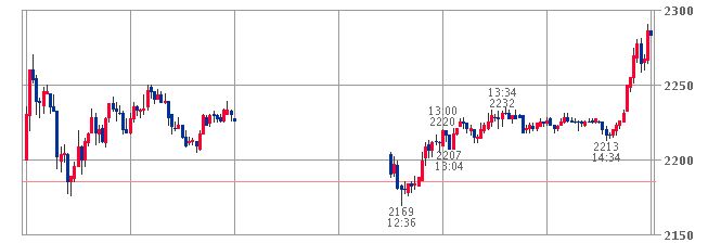 14:30になっても動きがなく2220円を下回る場面も出始めた。