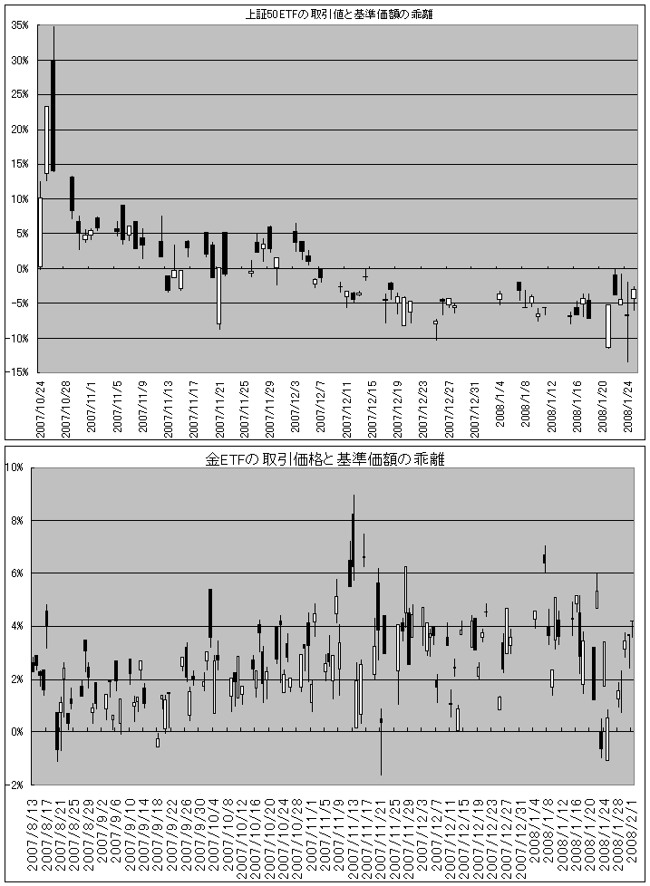 金、上証50ETFの基準価額と取引値の乖離(08/01E)