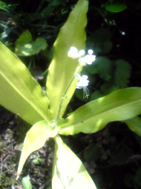 林の中にひときわ目立つ白い花です。ヤブミョウガでしょうか?