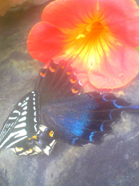 台風の前家の庭で飛んでいたカラスアゲハとアゲハチョウが台風のあいだ食事もとれず、死んでいて、その代わり蟻の役に立ったようです。羽だけ残して悲しげな姿に。思わず合掌。自分が生かされていることを感じます。他に、羽がビリビリのアゲハチョウやヤマトシジミなどが花の蜜を吸っていました。