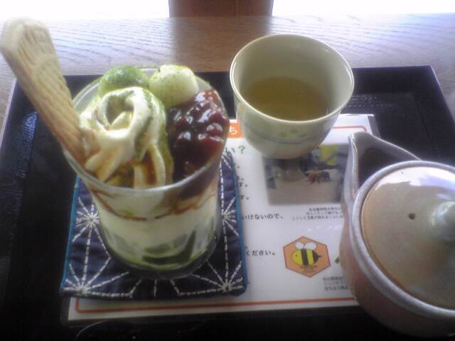 名園での抹茶パフェ、、気分も寧ぐ事でしょう。  うらやましい!。