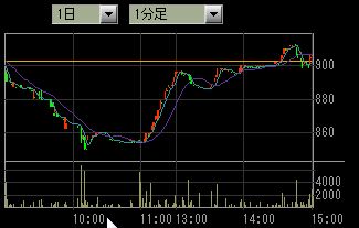 前場は利確に押されて849円まで下がり、後場寄りから謎の買い上がりで一気に上昇。